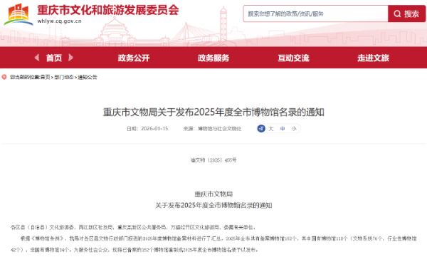 据悉,根据《博物馆条例》,市文物局对各区县文物行政部门报送的2025年度博物馆备案材料进行汇总,将已备案的152个博物馆编制成名录向社会公布。