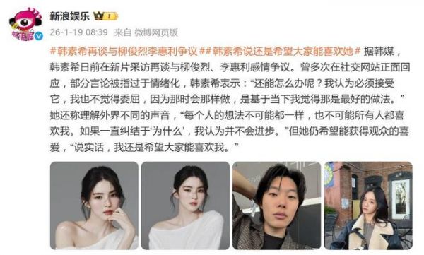 据1月19日报道,一句“还能怎么办呢?必须接受它”,让韩素希与柳俊烈、李惠利那场席卷韩网的“三角罗生门”再度被推上风口浪尖。在新片采访中,这位以“最美小三”出圈的女星,终于首度系统回应了那段让她口碑两极的争议,态度堪称“认错,但也不完全认”。