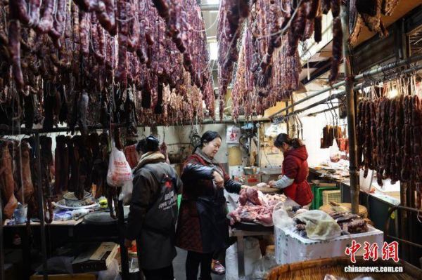 1月21日,四川省成都市新开寺街一家肉铺吸引顾客。中国农历春节将至,有着“香肠一条街”之称的成都新开寺街各家肉铺逐渐忙碌起来,腊肉、香肠飘香整条街道。中新社记者 张浪 摄