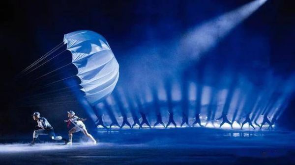 该剧摒弃繁杂的装饰与堆砌,舞美设计简约大气。如,在开场跳伞情节中,用足以承载15名空降兵的两排铁架寓意机舱内部,同时又以几处反光的亮片悬挂于舞台,以饰飞机两翼,既实现了舞台装饰的简约,同时也不会抢占人物光环。再如,在体现部队生活时,以几架铁床和一些简约的布景即完成了整个部队生活场景的塑造,这种符号化元素运用非常巧妙,观众一眼就能识别出剧中人物此时所处的生活空间;而在面对一些呈现较为复杂但又较少使用的布景时,则大胆借用多媒体显示,实现了传统与现代的有机融合,真正诠释了“将舞台完全交给演员”,很有戏曲“一桌二椅”的味道。