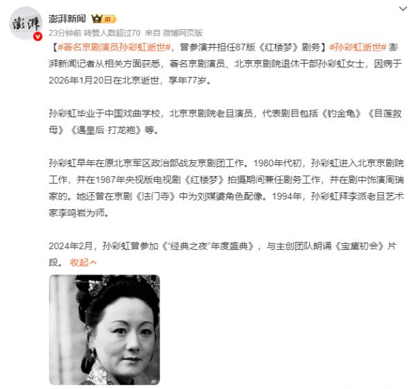 据报道称,著名京剧演员、北京京剧院退休干部孙彩虹女士,因病于2026年1月20日在北京逝世,享年77岁。