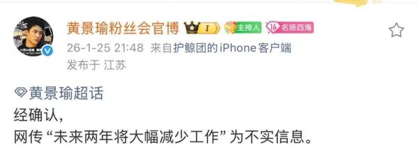 25日晚,黄景瑜粉丝会官博发文回应“网传黄景瑜未来两年将大幅减少工作”一事:“经确认,网传‘未来两年将大幅减少工作’为不实信息。”
