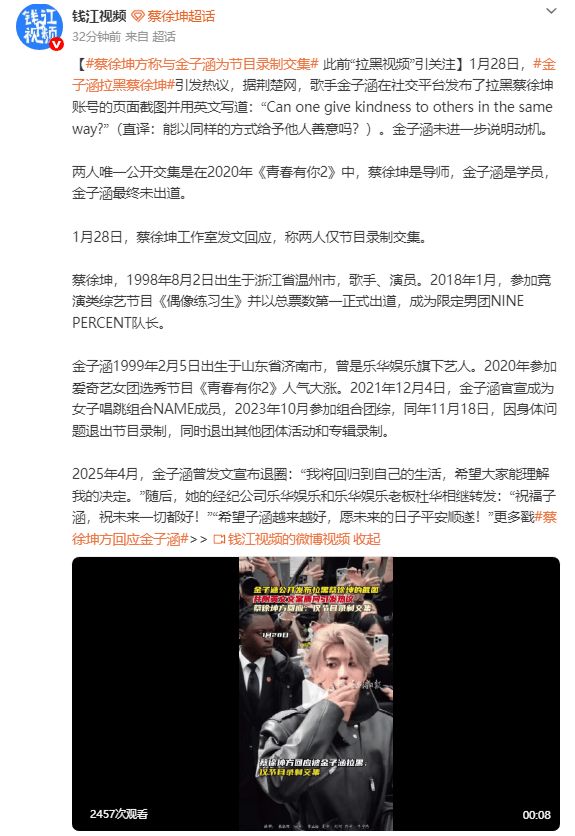 对此,蔡徐坤工作室于同日发文回应,称二人“仅节目录制交集”,间接澄清了外界猜测。此前,金子涵曾因身体原因暂停演艺活动,而蔡徐坤则继续其音乐与演艺事业。此次事件虽引起短暂风波,但双方并未有进一步互动或说明。