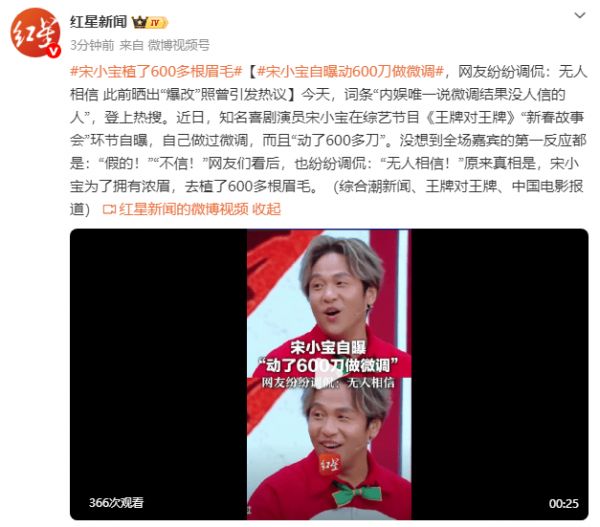 原来,宋小宝所谓的“动600多刀”实则是进行了眉毛移植手术,共种植了600多根眉毛以改善眉形。这一出人意料的“微调真相”曝光后,网友纷纷调侃:“这大概是内娱唯一说微调却没人信的演员了!”