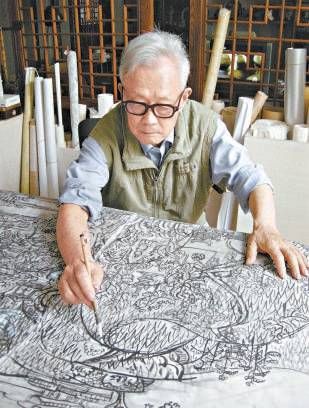 周令钊绘制丙烯壁画《长沙》(资料图)。