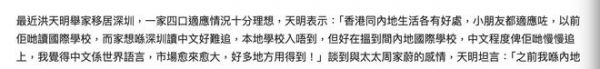 洪天明称如今一家四口在深圳生活的适应情况十分理想,完全没有顾虑。他表示香港与内地的生活各有好处。简言之就是香港是土生土长的地方,环境很熟悉,有亲切感,而内地是全新的生活地,但是生活超级便利,而且对于经常穿梭香港内地的他来说,早就已经适应以及习惯了当地的生活模式,妻子也入乡随俗,做自媒体,生活也不无聊。