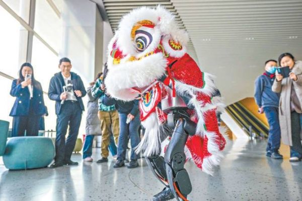 国家会议中心二期内,机器人在演练舞狮。 本报记者 武亦彬摄