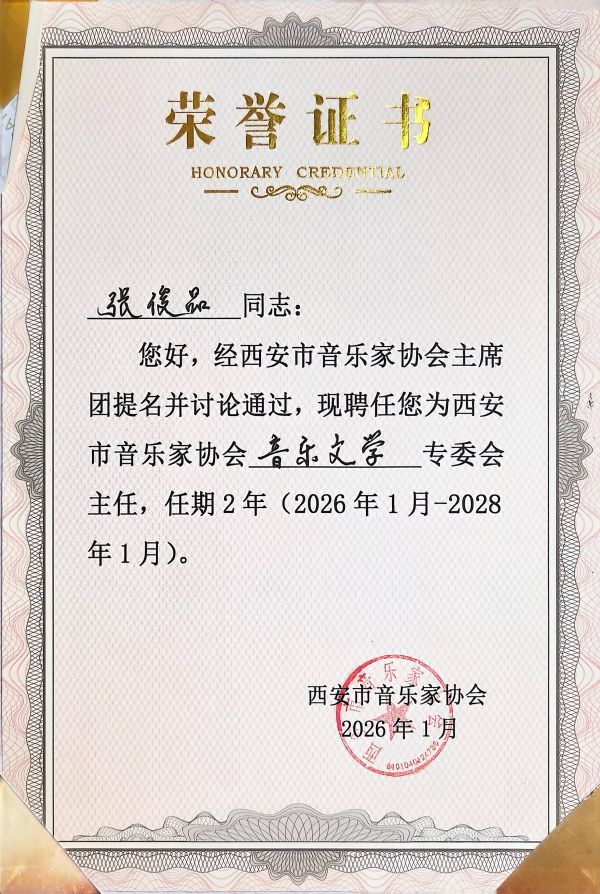 近日,经西安市音乐家协会主席团提名并讨论通过,张峻品同志正式受聘为西安市音乐家协会音乐文学专委会主任,任期为2026年1月至2028年1月。