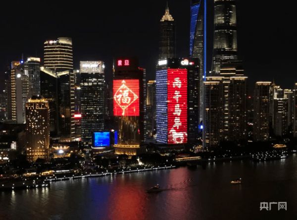 陆家嘴的震旦大楼、上海中心大厦等摩天楼外立面已滚动播放春节主题画面,将城市天际线染成温暖的红色。外滩防汛墙照明及瀑布开启颜色变化,沿岸建筑也已披上节日盛装。