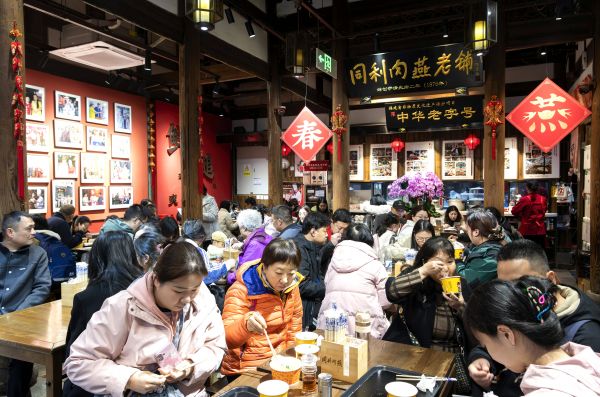 2月17日,游客在福州市三坊七巷同利肉燕老铺里品尝福州传统名小吃肉燕。 新华社记者 魏培全 摄