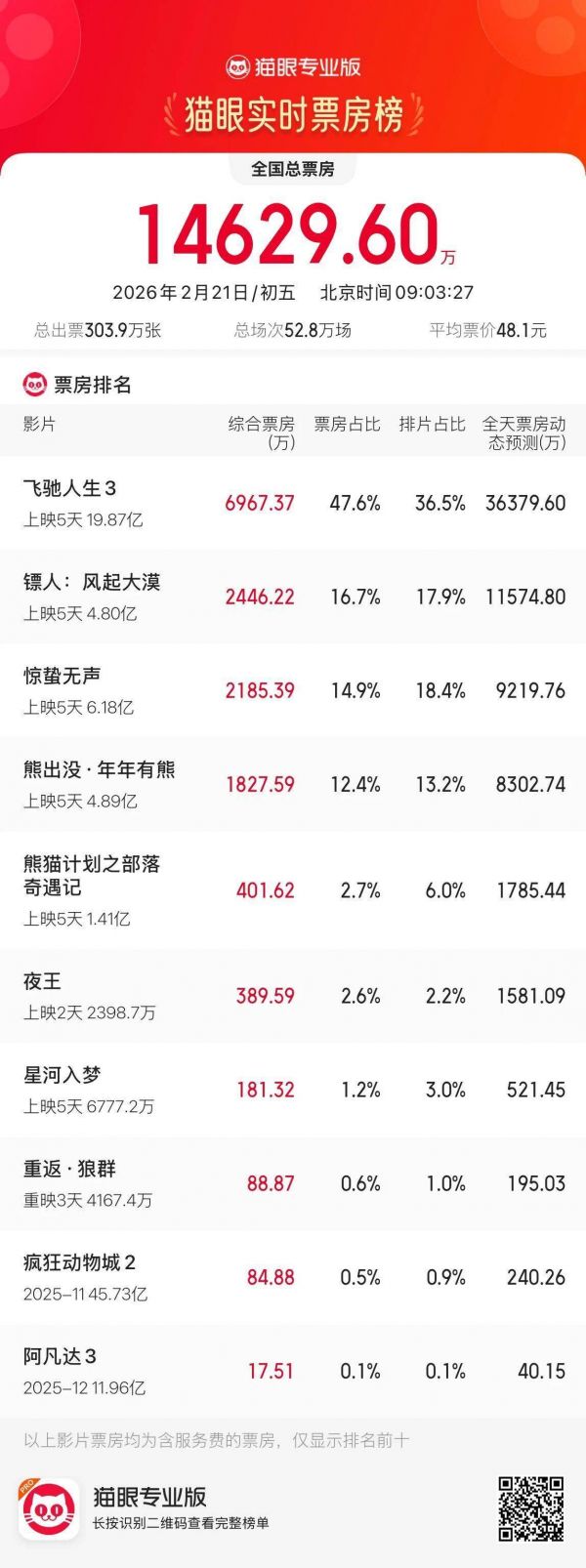 春节档连续5天破10亿《李焕英》逆袭《唐3》冲30亿