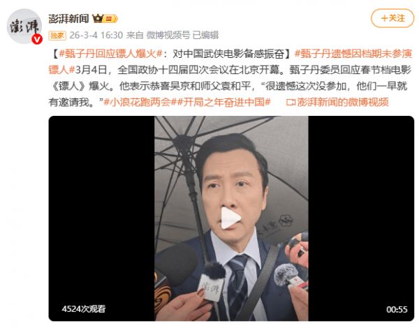 3月4日,全国政协十四届四次会议在北京开幕。政协委员甄子丹在会上谈及春节档影片《镖人》的火爆,他向吴京以及恩师袁和平送上祝贺,并坦言:“很遗憾这次没参加,他们一早就有邀请我。”