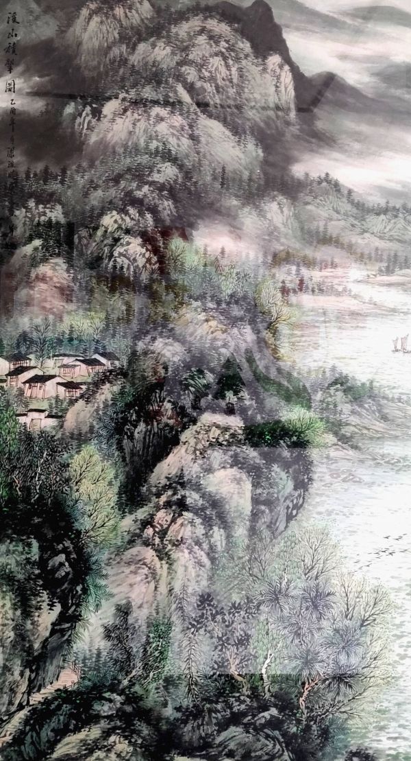 当我们凝视这幅作品时,首先被其扑面而来的葱郁生机所吸引。画面中,层峦叠嶂的山石、蜿蜒流淌的溪水、苍劲挺拔的林木,以及掩映其间的粉墙黛瓦,共同构成了一幅既真实可感又充满诗意的江南山水图景。它不仅是对自然物象的再现,更是画家内心世界的外化,是其对家园、对传统、对生命的深情凝视。