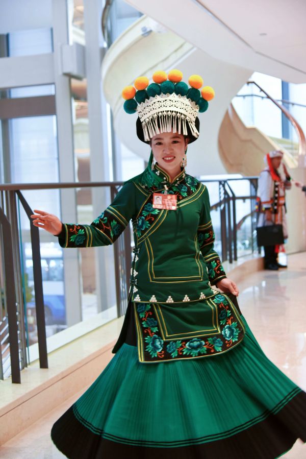 2026年3月5日,身着绿色彝族服饰的金瑞瑞。新华社记者 王贤思 摄