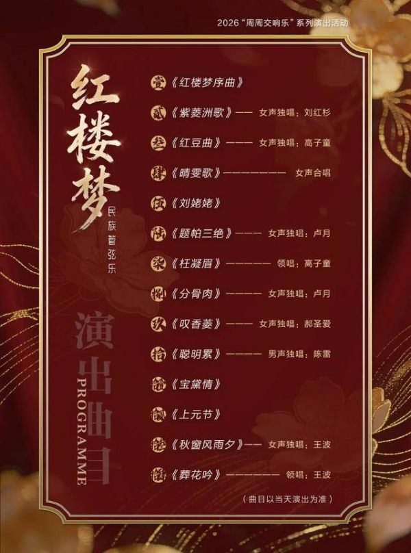本场音乐会是2026“周周交响乐”系列活动的内容之一。作为中国古典文学的巅峰之作,《红楼梦》早已刻进国人的文化基因。本场音乐会将以民族管弦乐为载体,让“黛玉葬花”“宝钗扑蝶”等经典场景,在音乐中鲜活再现,既是老戏迷的情怀之选,也是年轻人的国风入门课。