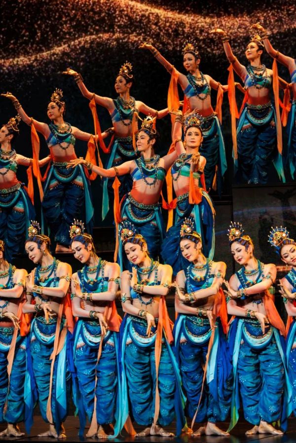 克孜尔石窟第38窟“天宫伎乐”壁画凝固着千年舞姿,那些S形“三屈式”体态与“龟兹手”为代表的佛印手势,曾是画师捕捉的瞬间永恒;舞台上,舞者通过呼吸控制与肌肉记忆,让静态线条获得流动的生命力,将壁画空间转化为三维身体场域;电视镜头则进一步通过特写放大指尖的微妙震颤,捕捉“撼头弄目”的韵律细节。《丝路古韵》从剧场版14人精简群舞到春晚34人恢弘阵容的扩容,从单一慢板到融入胡旋快板的节奏突破,正是媒介特性倒逼内容创新的典型案例——电视媒介对视觉冲击与情感浓度的需求,推动作品从博物馆式的复原展示转向文化叙事。