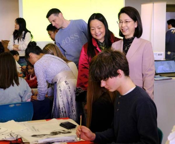 3月22日,在挪威“国际中文日”活动上,中国驻挪威大使侯悦(着粉衣者)、挪威中文学校校长袁军(着红衣者)观摩挪威学生练习中国书法。新华社记者 张玉亮 摄