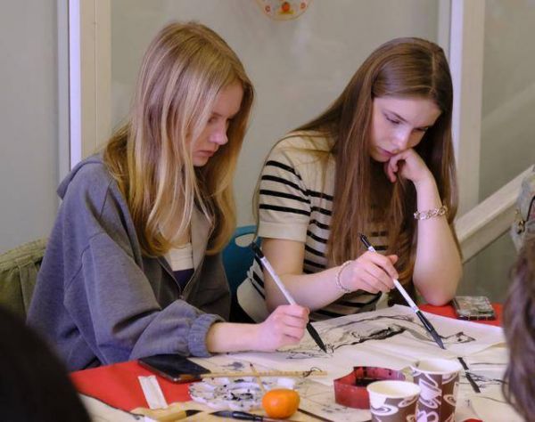 3月22日,在挪威“国际中文日”活动上,参与者在用毛笔作画。新华社记者张玉亮 摄