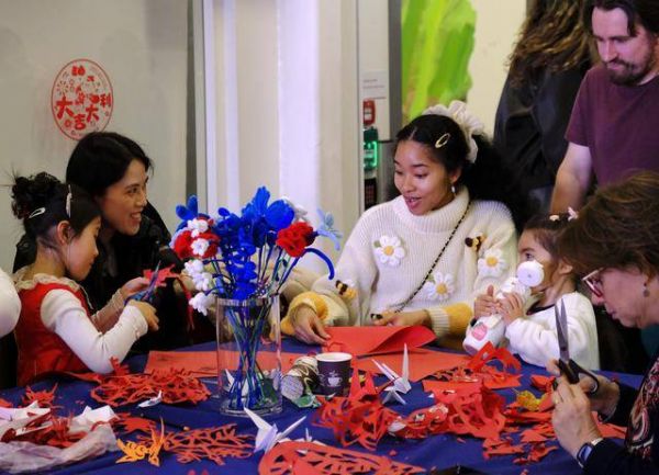 3月22日,在挪威“国际中文日”活动上,参与者在体验剪纸艺术。新华社记者 张玉亮 摄