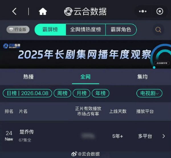 赵丽颖林更新楚乔传再登云合日榜
