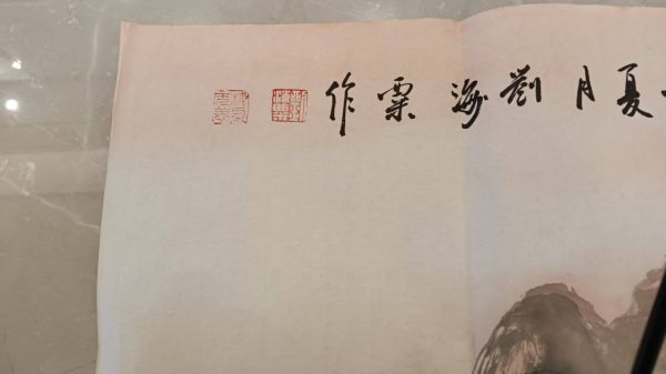 - **干湿互衬**:在泼洒过程中,刘海粟精准控制墨色与色彩的干湿程度,干笔皴擦表现山石的粗糙质感,湿笔晕染凸显云海的流动质感,干湿对比,让画面充满了节奏与韵律。