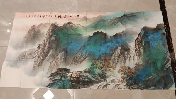 - **泼彩为魂**:以饱含水分的石青、石绿、朱砂等矿物颜料大胆泼洒,色彩浓艳鲜活,极具生命感。颜料在宣纸上自然晕化,与墨色交融,形成“墨中有彩、彩中有墨”的独特肌理,既还原了黄山峰峦的色彩变化,又赋予画面梦幻般的艺术效果。