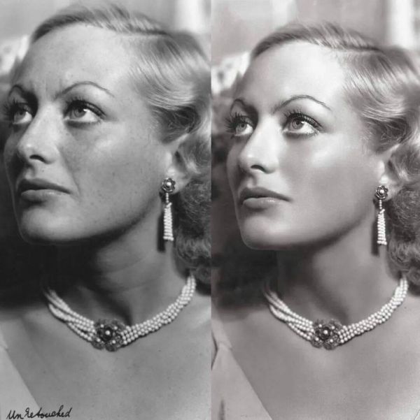 摄影师 George Hurrell 通过对大幅面底片的细致手工修版(manual retouching),打造出他独特的审美风格。Hurrell 要求拍摄对象不施粉黛地来到片场。他使用石墨粉、粉笔和染料,在冲洗前与修版师 James Sharp 工作数小时,以抚平瑕疵和不想要的面部纹路。他们甚至一丝不苟地描绘出更长、更具戏剧性的睫毛,并去除散乱的毛发,以实现理想的外观。