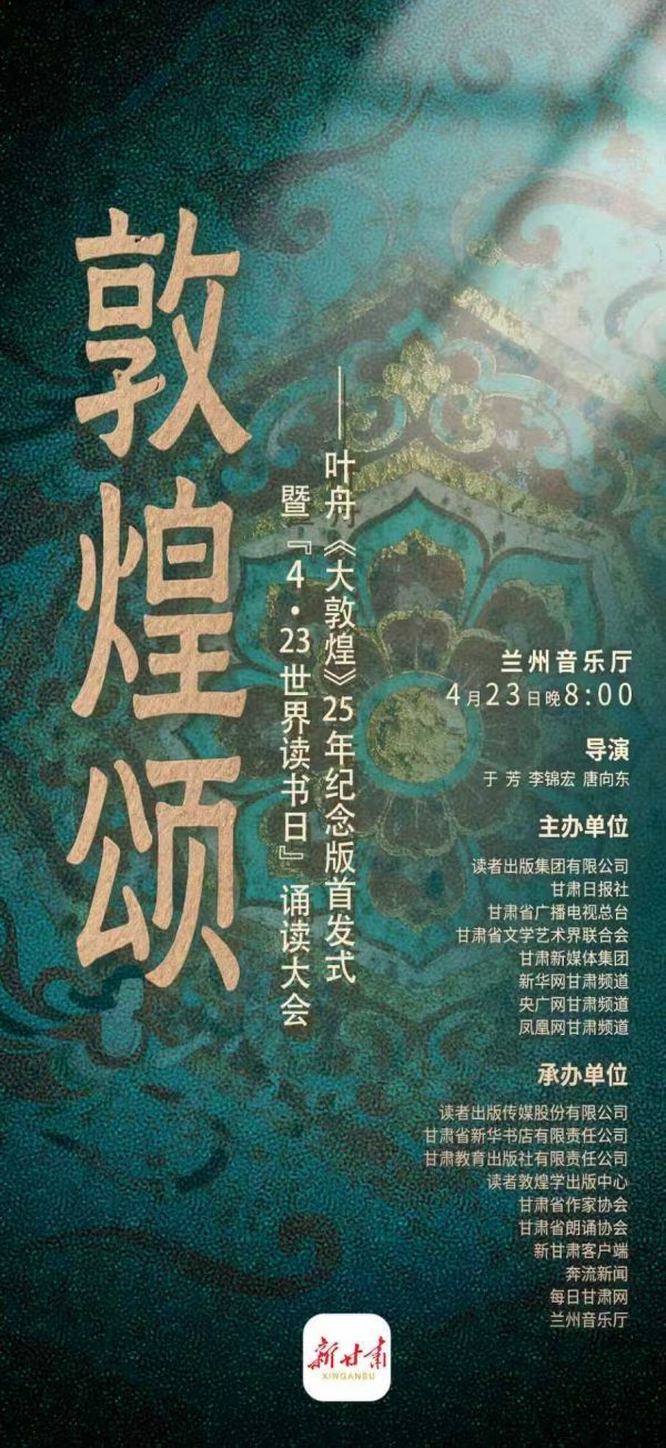 4月23日晚8时,“敦煌颂”叶舟《大敦煌》25年纪念版首发式暨“4·23世界读书日”诵读大会将在兰州音乐厅举办,以敦煌诗韵为全民阅读与“书香陇原”添彩。