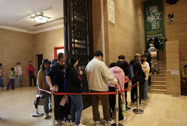 下午3点左右,距离闭馆还有两小时,观众热情不减,来看长信宫灯的队伍依然从五楼排到一楼,甚至延伸到室外。有工作人员对记者表示,“如果排队的人很多,该展厅可能会延长观展时间,但目前暂未收到通知。”