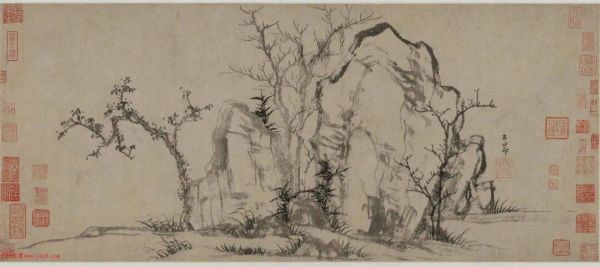 赵孟頫绘竹石,强调“以书法入画”,此幅绘古木新篁生于平坡秀石之间,以飞白法画石,以篆书法绘树,纯用水墨表现,是其“书画同源”之理论在绘画实践中的具体体现,也是元代文人画最有代表性的作品之一。