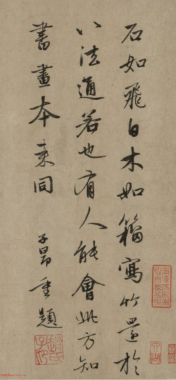 赵孟頫自题七言绝句:“石如飞白木如籀,写竹还于八法通。若也有人能会此,方知书画本来同。”子昂重题。