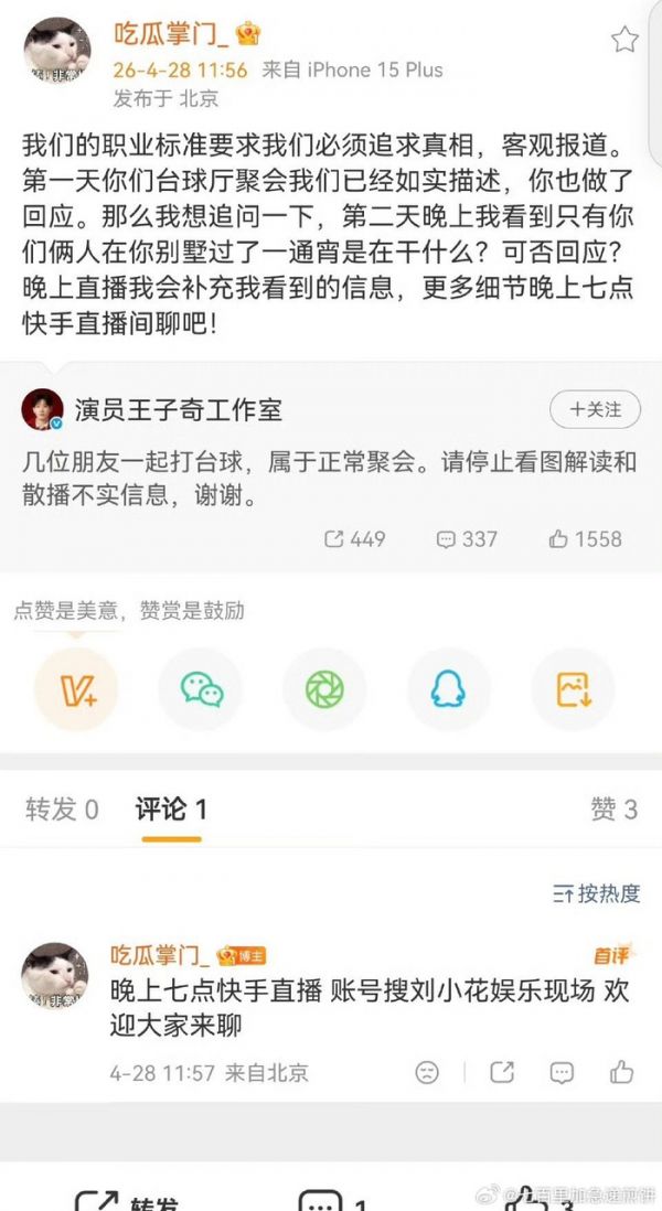 #王子奇方否认恋情# 王子奇工作室否认恋情后,狗仔又转发了