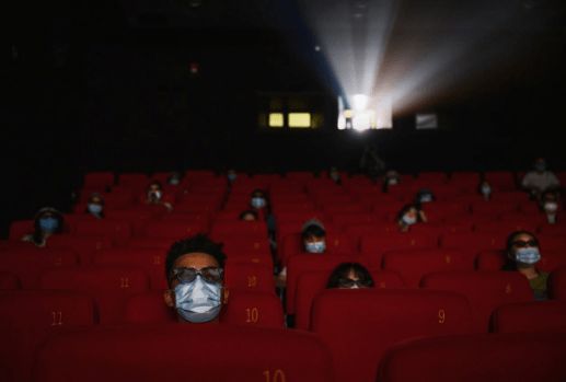 2020年7月24日,北京影院在关闭六个月后复工,戴口罩的观众隔席而坐。