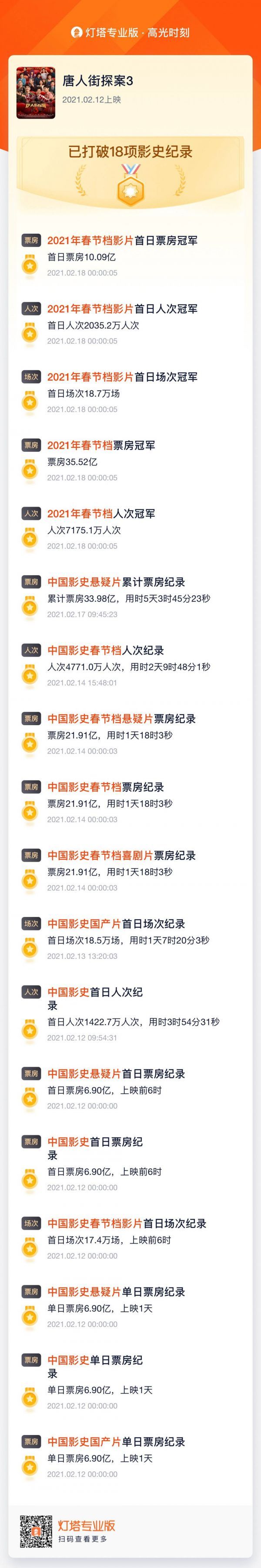 《唐人街探案》打破18项影史纪录。资料来源:灯塔专业版