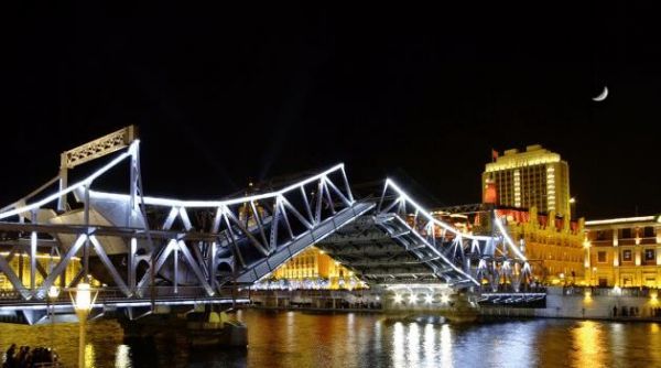 这个大桥其实就是采用的转体技术,当车辆通行的时候,中间的桥段就会自动转过来,然后当轮船需要通行的时候,桥段就会转成到中间,这样轮船也能通行,其实这样的设计在天津也有一个,不过那个桥不一样的是。