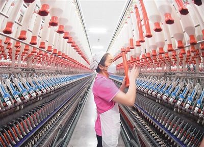 湖北省宜城市一家纺织公司内,工人正在车间生产线上忙碌。