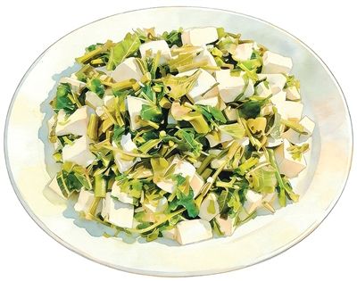香椿头拌豆腐素净清雅、鲜香质朴,不仅是应季美味,更暗含清明廉洁、身心清净的意趣,渐渐成为一道颇为雅致的文人菜。明代李濂在《村居》中写“留客剪椿芽”,剪下鲜嫩欲滴的椿芽,将春色一同端上饭桌;清代李渔在《闲情偶寄》中提到香椿,称“菜能芬人齿颊者,香椿头是也。”到了现代,美食家汪曾祺更是偏爱,称“香椿拌豆腐是拌豆腐里的上上品”“一箸入口,三春不忘”。